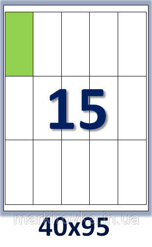 Самоклеющаяся папір формату А4.Етикеток на аркуші А4: 15 шт. Розмір: 40х95 мм. Упаковка 100 аркушів/1500 етикеток