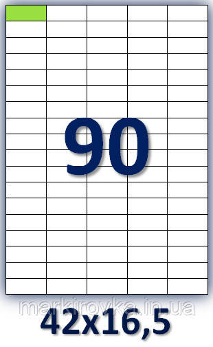 Самоклейний папір формату А4. Етикеток на аркуші А4: 90 шт. Розмір: 42х16,5 мм. Упаковка 100 аркушів/9000 етикеток